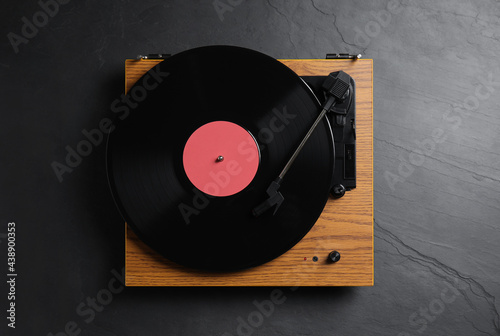 Obraz premium Modern vinyl record player with disc on black background, top view