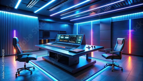 Fototapeta premium Modern virtual studio setup with futuristic equipment, LED lights, and sleek console, surrounded by empty space, ready for digital music production or podcast recording.