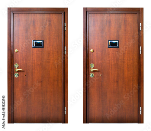 Obraz premium Modern walnut wooden looking steel two door, front door, electronic security...