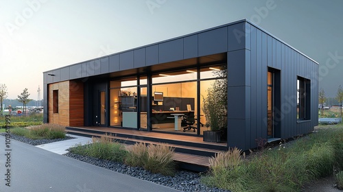 © Gibster, Fototapeta premium modern warehouse exterior featuring sleek design with large windows and small office space. building is surrounded by greenery, creating harmonious blend of nature and architecture