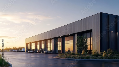 Fototapeta premium Modern warehouse featuring a sleek exterior design.