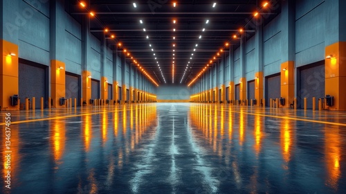 © Art Sof galery photo, Fototapeta premium Modern warehouse interior with bright lighting, polished floor, and multiple loading docks.