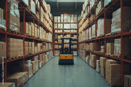 © Sunshine, Obraz premium Modern Warehouse Interior with Forklift and Stacked Boxes on Shelves in Industrial Storage Facility