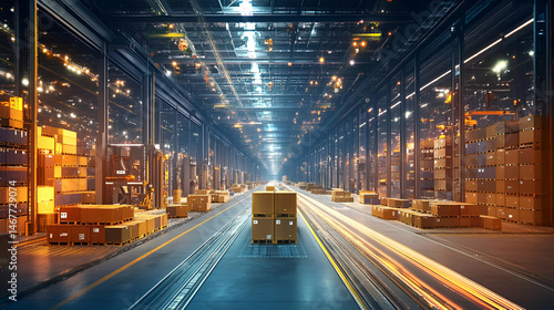 Obraz premium Modern Warehouse Interior with Stacked Cardboard Boxes at Night