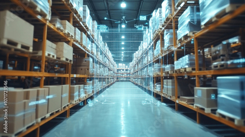 Fototapeta premium Modern warehouse, shelves filled with paper boxes, scanning data