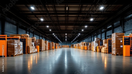 © khonkangrua, Obraz premium Modern Warehouse with Stacked Boxes and Pallets