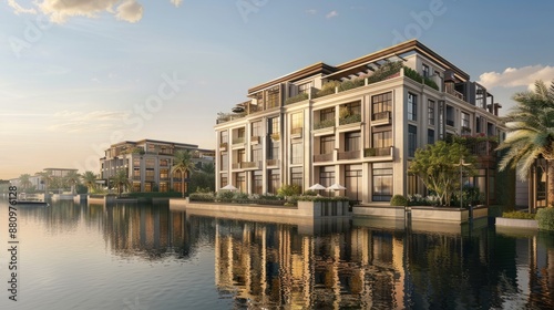 Fototapeta premium Modern Waterfront Apartments with Serene Reflections at Sunset