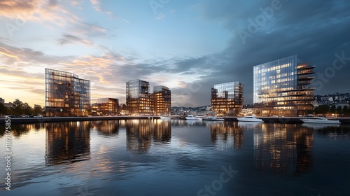 © Farid, Obraz premium Modern Waterfront Buildings Reflecting in Calm Water at Dusk