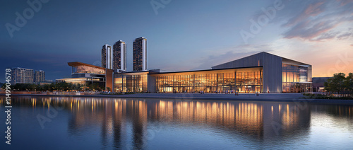 © Crealif76, Fototapeta premium Modern waterfront convention center at dusk.