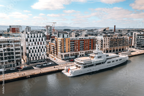 Naklejka premium Modern Waterfront in Dublin Featuring Luxury Yacht, Contemporary Architecture, and Scenic Urban Landscape under Clear Blue Sky