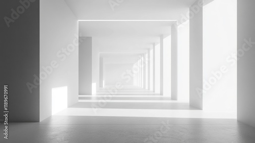 Fototapeta premium Modern White Architecture Corridor, Minimalist Interior Design, Bright Light, Empty Space, Clean Lines, Perspective View