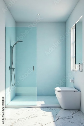 © AiGallery, Obraz premium Modern white bathroom with a large blue glass shower door and marble floor, white, marble, clean