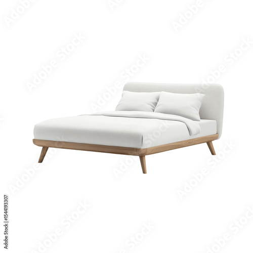 © EasyNex, Obraz premium Modern white bed with fabric upholstery and wooden legs in a realistic 3D render