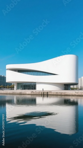 © meng, Obraz premium Modern white building with a curved design reflected in calm water under a clear blue sky