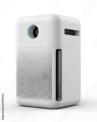 Obraz premium Modern white electronic device features a perforated front surface and indicator light detail