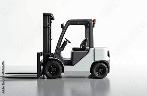 © Vadym, Fototapeta premium Modern white forklift isolated on white background. Industrial vehicle with forks for lifting and moving cargo. Electric heavy machinery for warehouse logistics and distribution center operations.