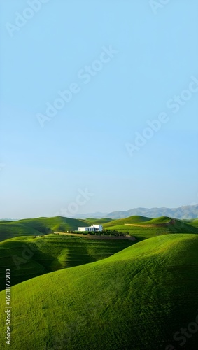 Obraz premium Modern white house nestled amongst rolling green hills under a clear blue sky