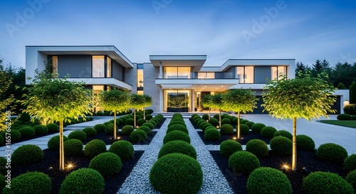 © Eunseom, Obraz premium Modern White House with Green Garden at Dusk