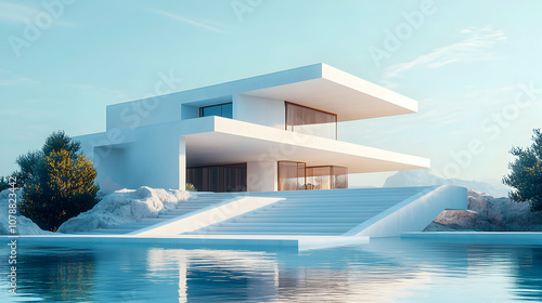 Fototapeta premium Modern White House with Pool and Steps Leading to the Water
