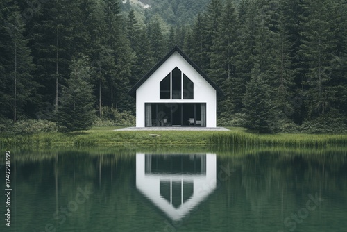 © gamespirit, Fototapeta premium Modern white house with striking architecture located by a tranquil lake surrounded by dense evergreen forests during a calm afternoon