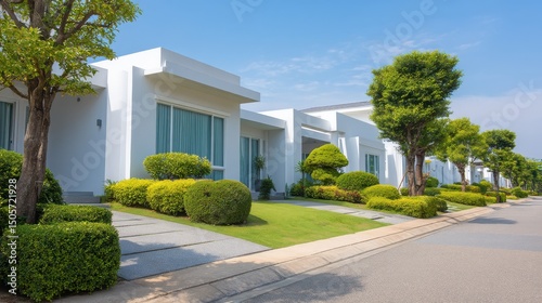 © antusher, Naklejka premium Modern white houses among trees in suburban area under bright blue sky