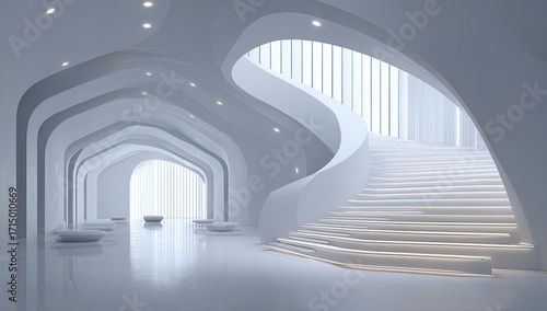 © Mind Sketcher, Fototapeta premium Modern white interior design with curved staircase