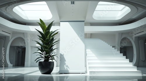 © Andi, Obraz premium Modern white interior with stairs plant and blank display