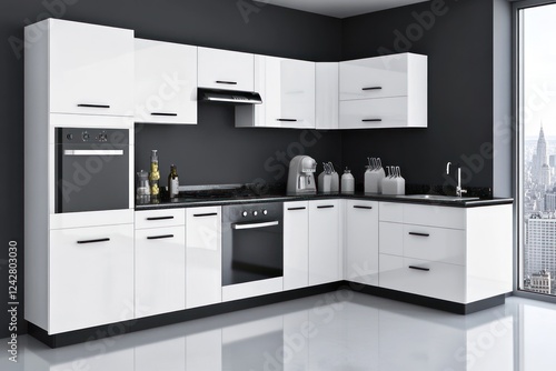 Fototapeta premium Modern white kitchen, city view, cooking appliances, minimalist design, home interior