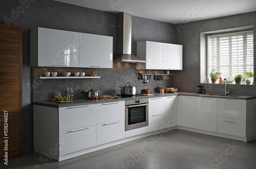 © DARPANA, Fototapeta premium Modern White Kitchen Design With Grey Textured Backsplash