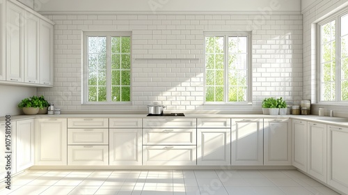 Fototapeta premium Modern White Kitchen Interior Design with Windows and Sunlight
