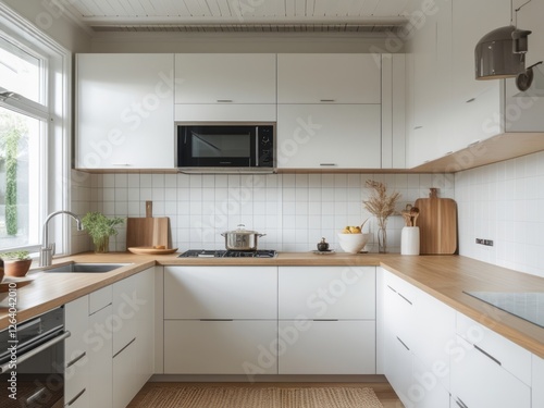 Fototapeta premium Modern White Kitchen With Light Wood Countertops