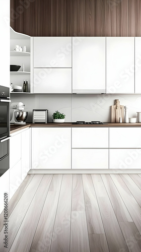 Fototapeta premium Modern White Kitchen with Wooden Backsplash and Light Wood Floors Creates a Clean and Minimalist Space.