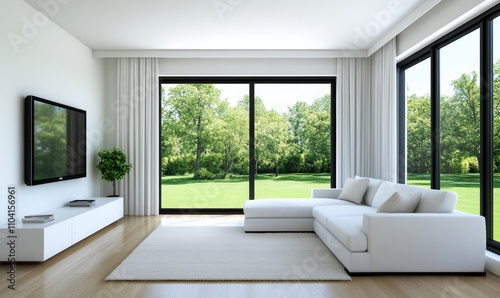 Fototapeta premium Modern white living room interior with stunning backyard view; uses white, green, and natural colors