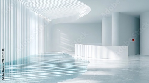 Obraz premium Modern white lobby, curved walls, water reflection, sunlight. Use...