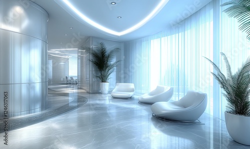Fototapeta premium Modern white lounge area with curved walls, large windows, and potted plants