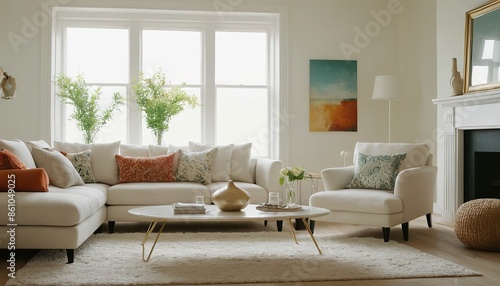 © soyibakter, Fototapeta premium Modern, white minimalist interior with kitchen, sofa, wood floor, wall panels and marble kitchen island.