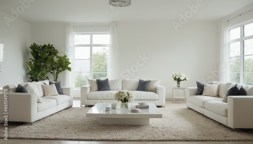 © soyibakter, Fototapeta premium Modern, white minimalist interior with kitchen, sofa, wood floor, wall panels and marble kitchen island.