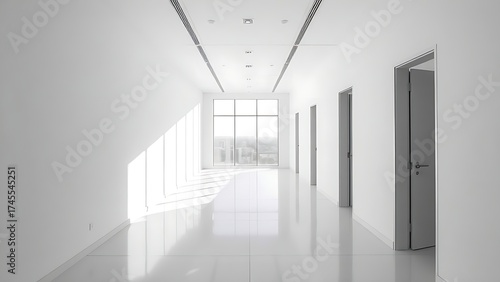 Fototapeta premium Modern white office corridor with large windows and clean lines.