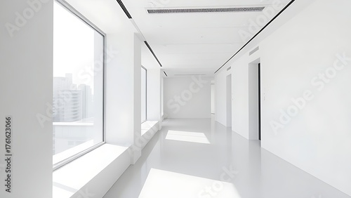 Fototapeta premium Modern white office corridor with large windows and clean lines.