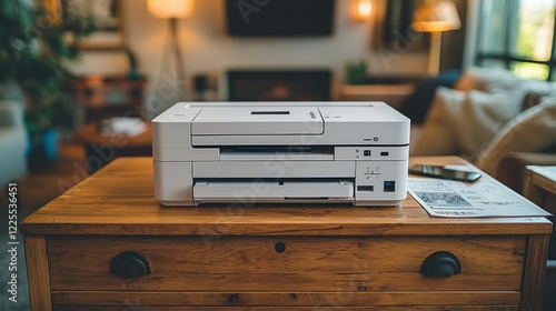 © Biancaart, Fototapeta premium Modern White Printer Sits On Wooden Desk In Home Office
