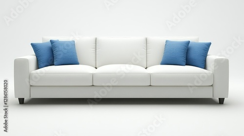 © Basileus, Fototapeta premium Modern white sofa featuring blue cushions against a white backdrop