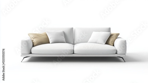Fototapeta premium Modern White Sofa with Beige Pillows on White Background