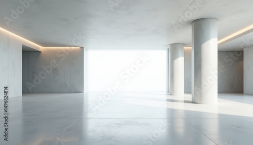 © Zoe, Obraz premium Modern White Space Symmetrical Columns Lining a Bright Reflective Corridor an Empty Architectural Composition