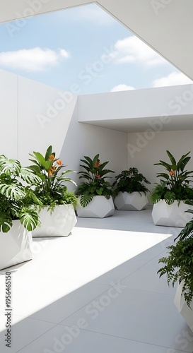 Fototapeta premium Modern white terrace with lush green potted plants and geometric planters...