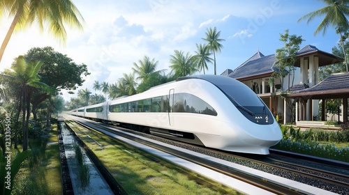 Naklejka premium Modern white train speeding through tropical landscape with palm trees and luxurious villa