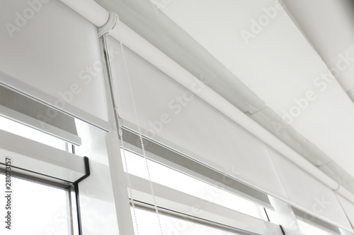 Obraz premium Modern window with white roller blinds indoors