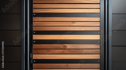 © Soulin7, Fototapeta premium Modern wood and metal gate featuring horizontal slats and a sleek black steel frame
