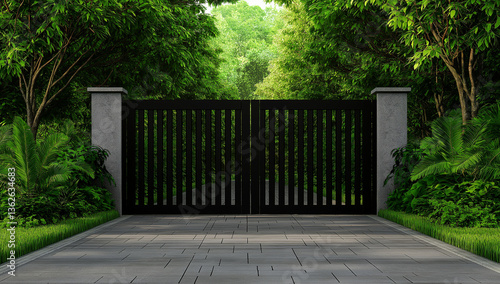 Obraz premium Modern wooden and stone gate surrounded by lush greenery, creating serene...