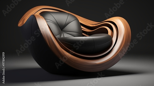 Obraz premium Modern Wooden Armchair with Black Leather Upholstery