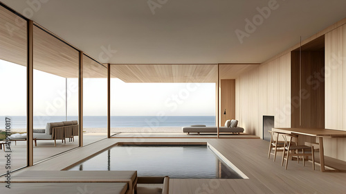 © artzone, Fototapeta premium Modern Wooden Beach House Interior With Pool And Ocean View On A Sunny Day